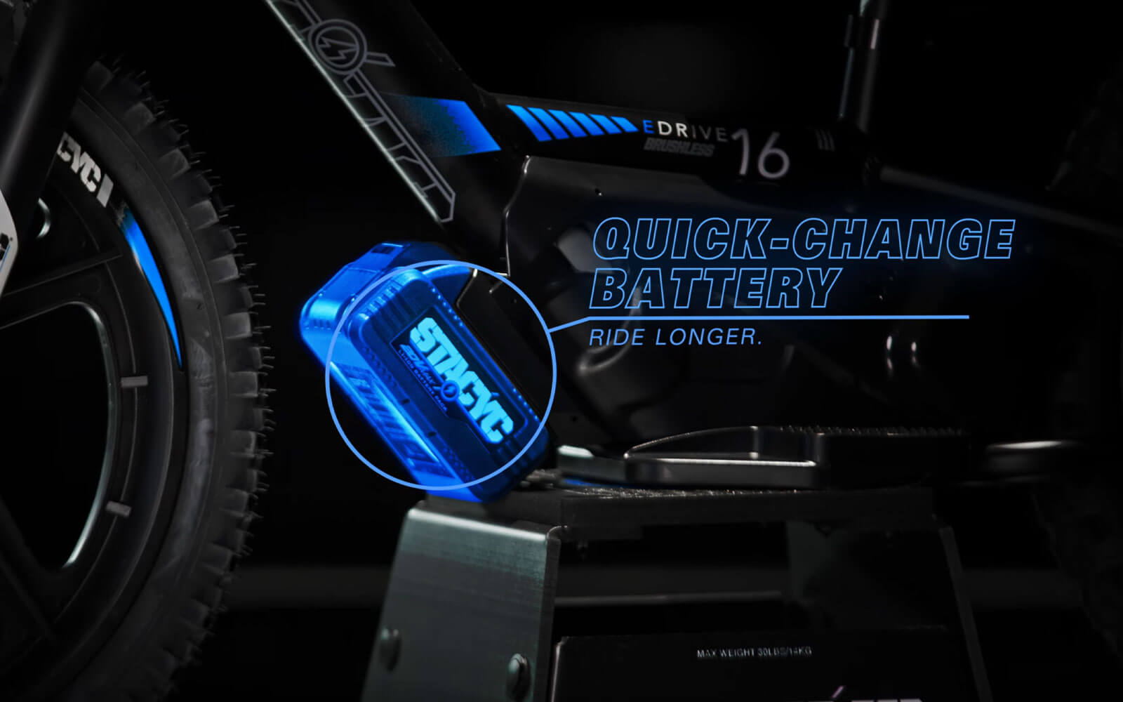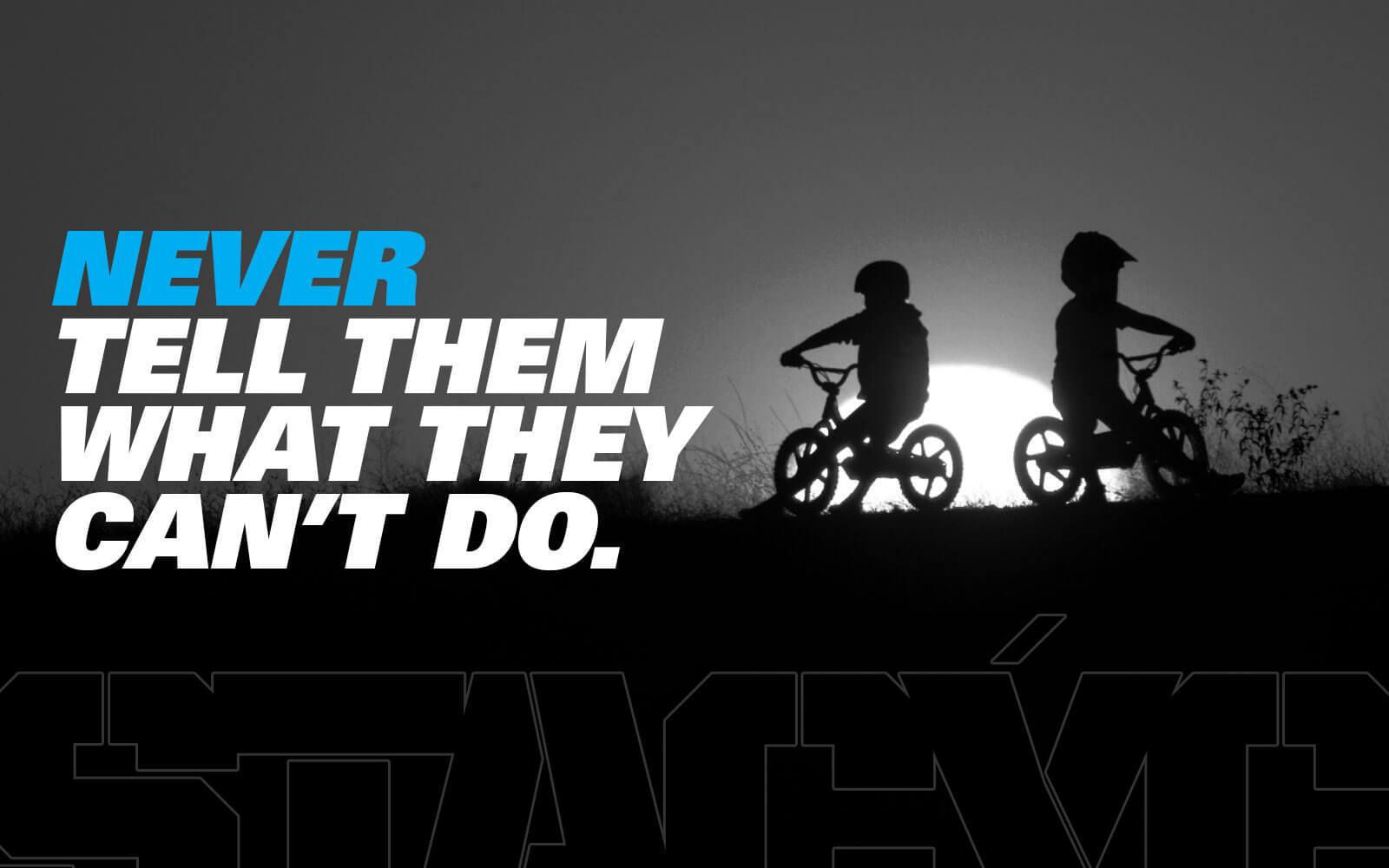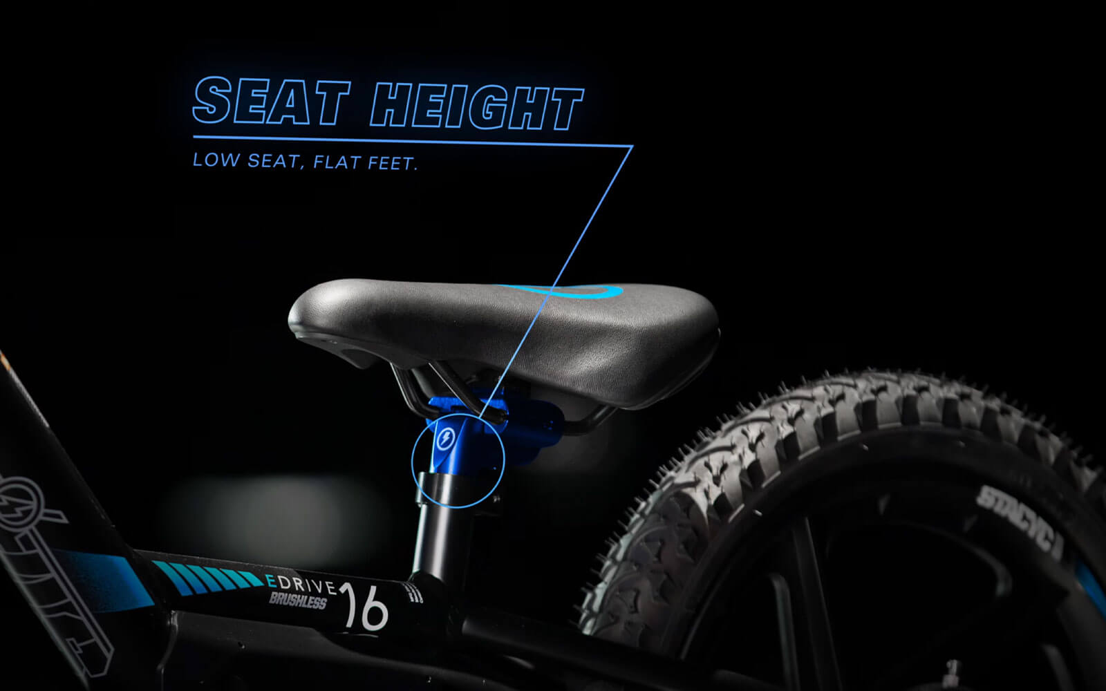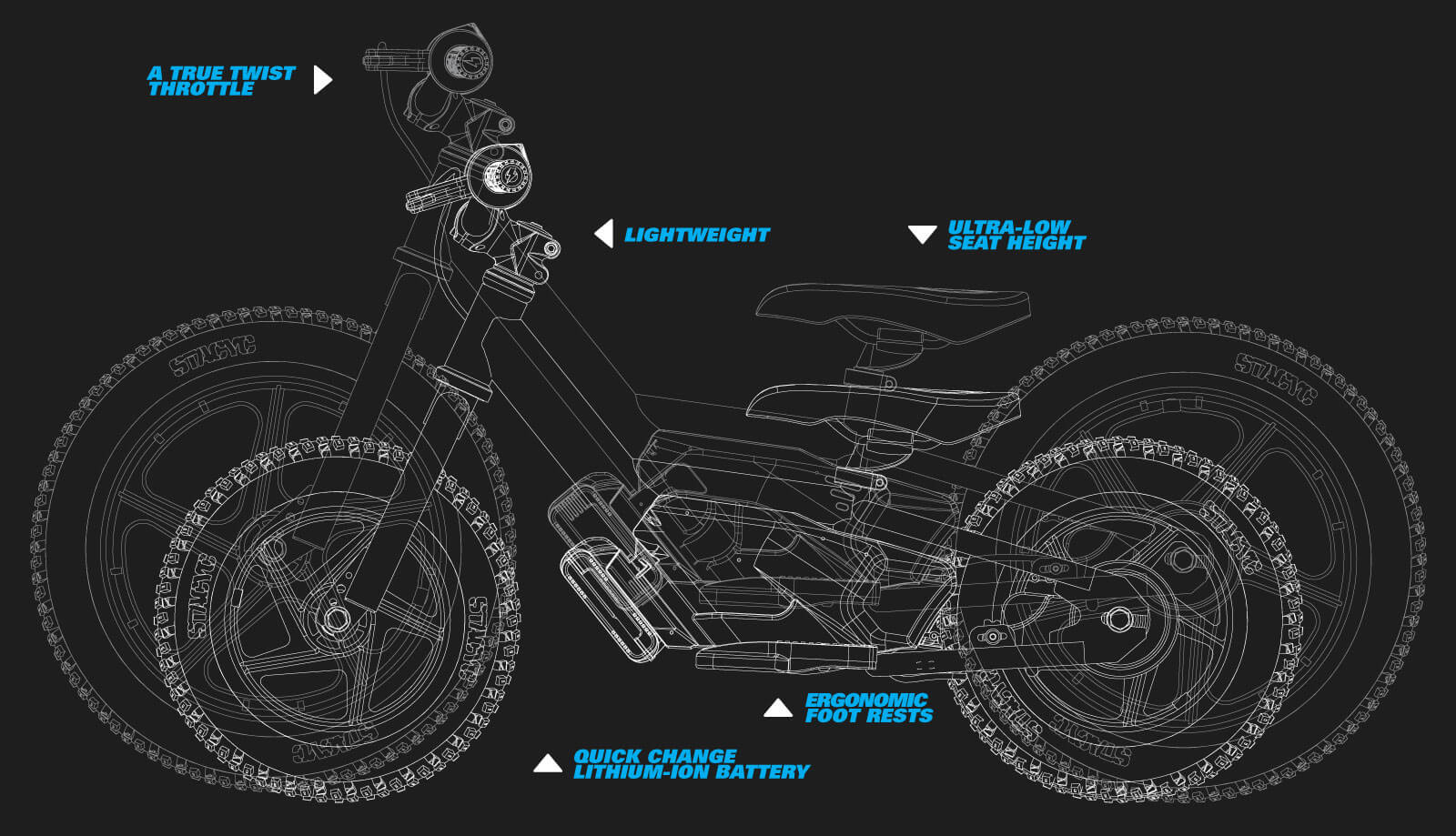 Race inspired electric stability bikes with atraumatic shape for proper body and foot positioning when standing, teaching proper bike riding position.